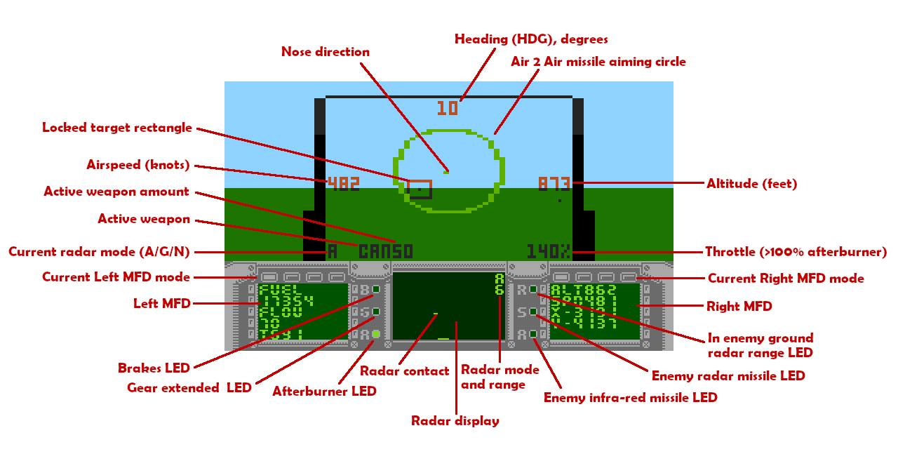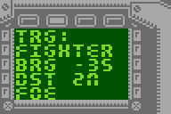 Currently locked by radar target is put in rectangle on HUD (or between 2 lines when Sidewinders wepon is active and they cannot lock on target).