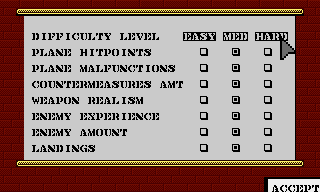 It is recommended to aim at the hardest playable settings first and only change "Plane hitpoints", "Countermeasures amt" and "Weapon realism" to MEDIUM make game less challenging.